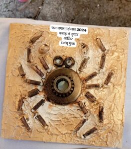 बी आर वर्मा सीईओ जनपद पंचायत कुरूद द्वारा जल जागर महोत्सव में आर्ट एग्जिबिशन और वर्कशॉप के लिए कलाकार जानकी गुप्ता को प्रशस्ति पत्र प्रदान किया गया.कलाकार,समाजसेवी जानकी गुप्ता ने बताया कि वे एक आर्ट टीचर 2008 से विभिन्न स्कूल में कला शिक्षिका के पद पर कार्यरत है. बहुत से उनके स्टूडेंट्स कला प्रतियोगिता मे इंटरनेशनल और नेशनल लेवल पर पहुंचकर अपने जिले का नाम रोशन कर चुके है बच्चो को सिखाने की धुन में वे अपनी कला का प्रदर्शन करना भूल गई थी ,मुझे अपने आर्ट को और बेहतर बनाने के लिए प्रेरित करने और मंच प्रदान करने के लिए धमतरी जिला प्रशासन को हृदय से आभार प्रदर्शित करते हुए कहा की हतोत्साहित हो कर अपना कार्यक्षेत्र बदल चुके कलाकारों को इस प्रदर्शनी ने पुनः जीवंत कर दिया कलाकारों को प्रोत्साहन एवं मंच प्रदान करके स्वरोजगार के लिए प्रेरित करना ,कबाड़ से जुगाड कर रियूज रिसाइकल के द्वारा पर्यावरण संरक्षण से स्कूल के बच्चो को जोड़ना और जन जन तक पानी के महत्व को समझाने और सहेजने के इस महोत्सव की असीम सफलता के कलेक्टर व पूरी टीम का सराहनीय और अतुलनीय प्रयास है , विभिन्न शासकीय गैर शासकीय विभाग द्वारा आयोजित नेशनल, स्टेट और डिस्ट्रिक्ट लेवल ड्रॉइंग प्रतियोगिता में कई बार प्रथम स्थान पर रह चुके देवांशू गुप्ता के द्वारा बनाया गया ऑटो पार्ट्स से मुर्गा ,स्प्रिंग से मकड़ी और साईकिल के चैन से बनी उल्लू आकर्षण का विषय रहा लोगो ने जमकर फोटो खींचे, कृति फाईन आर्ट्स के नव कलाकारों श्रेया अग्रवाल, लावण्या अग्रवाल , समीक्षा अग्रवाल , तनिषा महावार, अर्शिया गोयल , काव्या,विहान गोयल,परी रामरच्छानी,संस्कृति ,समृद्धि गुप्ता आदि के द्वारा अंब्रेला डेकोरेशन कर पंडाल को सजाया गया एवं जल संरक्षण विषय पर बनी पेंटिंग की प्रदर्शनी लगाई गई.