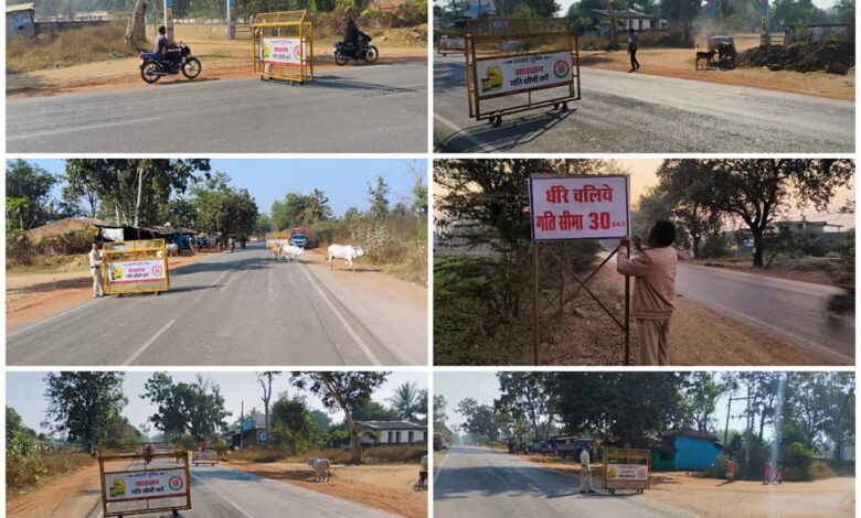 धमतरी। उप पुलिस अधीक्षक यातायात मणीशंकर चन्द्रा के नेतृत्व में यातायात पुलिस द्वारा ग्राम दुगली, धमतरी-नगरी राजकीय राजमार्ग 23, जहाँ से अनेक छोटी बड़ी वाहनें प्रतिदिन तेज रफ्तार से गुजरती है, जिससे सड़क दुर्घटना की संभावना बनी रहती है, दुर्घटना की रोकथाम एवं स्कूली छात्र-छात्राओं के सुरक्षा के दृष्टिगत शासकीय उच्च. मा. वि. एवं गट्टासिल्ली मोंड़ दुगली के पास वाहनों के गति नियंत्रण हेतु स्टापर का जिग-जैग बनाकर लगाया गया। इसी क्रम में सेहराडबरी के पास घटित सड़क दुर्घटना जिसमें भखारा थाना में पदस्थ पुलिस आरक्षक केशव मुरारी सोरी की तेजगति से चल रहे अज्ञात टैंकर वाहन के द्वारा ठोकर मारकर एक्सीडेंट करने से मौके पर ही मौत हो गया उक्त घटना स्थल का निरीक्षण कर सड़क सुरक्षा उपाय के तहत सड़क दुर्घटना की पुनरावृत्ति रोकने एवं तेजगति से चलने वाले वाहनों में अंकुश लगाने हेतु घटना स्थल सेहराडबरी के पास स्टापर का जिग-जैग बनाकर आदेशात्मक गतिसीमा बोर्ड लगाया गया।