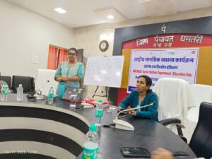 धमतरी 17 जनवरी 2025/ कलेक्टर सुश्री नम्रता गांधी की अध्यक्षता में आज राष्ट्रीय मानसिक स्वास्थ्य कार्यक्रम अंतर्गत जिला पंचायत धमतरी सभाकक्ष में मानसिक स्वास्थ्य संबंधी प्रशिक्षण का आयोजन किया गया। उक्त प्रशिक्षण में जी.आर.सी.(जेन्डर रेसोर्स सेन्टर) के स्टेरिंग कंमिटी के मेम्बर, महिला एवं बाल विकास विभाग, शिक्षा विभाग एवं पुलिस विभाग के अधिकारी/कर्मचारी उपस्थित थे।