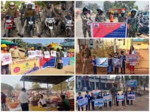 सड़क परिवहन राजमार्ग मंत्रालय नई दिल्ली के निर्देशानुसार 35 वॉ राष्ट्रीय सड़क सुरक्षा माह का आयोजन किया जा रहा है। जिसमें आज सत्रहवें दिवस को थाना रूद्री प्रभारी उनि अमित बघेल के द्वारा भव्य ब्रिलियेंट एकेडमी के नन्हे बच्चों के साथ रूद्री रोड किनारे हाथों में यातायात नियमों से संबंधित स्लोगन युक्त बैनर, पोस्टर लेकर बच्चों के द्वारा आवागमन करने वाले वाहन चालकों को यातायात संबंधी नारा लगाते हुए सड़क सुरक्षा अपनी सुरक्षा, गतिसीमा का पालन करने, सड़क सुरक्षा उपकरण हेलमेट, सीटबेल्ट का प्रयोग करने, शराब सेवन कर वाहन नही चलाने, यातायत नियमों को अपने जीवन में अपनाने का अपील कर यातायात नियमों के प्रति जागरूक किया गया।थाना दुगली पुलिस एवं भारतमाला परियोजना दीलिप बिल्डकॉन लिमिटेड के अधिकारी, कर्मचारियों के द्वारा दुगली में ओयोजित मंडई में आये ग्रामीणजन, व्यवसायीगण में यातायात सुरक्षा के प्रति जागरूक करने के लिए ग्राम दुगली में हेलमेट जागरूकता रैली का आयोजन करते हुए चौक में पहुंचकर ग्रामीणजन को सड़क दुर्घटना से बचने, सड़क सुरक्षा नियमों को अपनाने जागरूक कर यातायात नियमों की जानकारी दी गई।यातायात नियमों के प्रति ग्रामीणजन को जागरूक करने के उद्देश्य से यातायात जागरूकता रथ आर. गणपत डिंडोलेकर ग्राम माकरदोना साप्ताहिक बाजार में पहुंचकर बाजार में आये ग्रामीणजन, व्यवसायियों को यातायात नियमावली पॉम्पलेट वितरण कर पीए सिस्टम के माध्यम से यातायात नियमों के बारे में जानकारी देकर हमेशा यातायात नियमों का पालन करने अपील की गई।