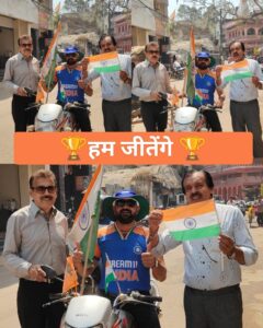 धमतरी। आज चैम्पियंश ट्राफी का फायनल मैच भारत व न्यूजीलैंड के बीच खेला जाएगा। दोपहर 2.30 बजे मैच शुरु होगा इसके पूर्व ही शहर के क्रिकेट प्रेमियों में उत्साह चरम पर है। क्रिकेट प्रेमी योगेश रायचुरा, ने भारत की जर्सी पहनकर शहर में तिरंगा लहराया। जिसका क्रिकेट प्रेमी हूकुमचंद मिन्नी व रमेश मिन्नी सहित शहरवासियों ने हौसला अफजाई किया।