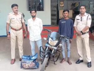 धमतरी। थाना कुरूद को मुखबिर से सूचना मिली की दो व्यक्ति एक काले रंग के होंडा साईन मोटर सायकल में अवैध रूप से शराब रखकर नारी रोड की ओर जा रहे है की सूचना पर घेराबंदी कर दो व्यक्ति को पकड़ा गया। जिसमें भीषम साहू पिता स्व.रेख राम साहू 21 वर्ष एवं नरेश साहू पिता कोमल साहू 20 वर्ष भरदा निवासी के पास से तलाशी लेने पर थैला के अंदर 90 पौवा देशी प्लेन शराब सीलबंद देशी प्लेन शराब प्रत्येक में 180-180 एम.एल.भरी हुई कुल 16.200 बल्क लीटर कीमती 8,100 रूपये एवं होंडा साईन कीमती 20,000 रूपये कुल 28,100 रूपये को समक्ष गवाहों के जप्त कर आरोपीगण के विरूद्ध थाना कुरुद में धारा 34 (2) आबकारी एक्ट का अपराध पंजीबद्ध कर आरोपियों को विधिवत् गिरफ्तार न्यायिक रिमांड पर भेजा गया है।