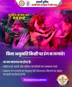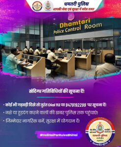 जिला धमतरी पुलिस द्वारा होली त्यौहार को शांति एवं सुरक्षा के साथ मनाने हेतु आम जनता से अपील की गई है तथा सोशल मीडिया में पोस्टर जारी किए गए हैं.