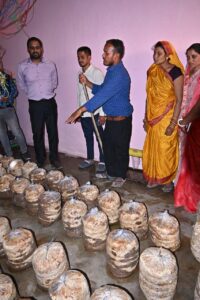 कलेक्टर श्री अबिनाश मिश्रा ने आज अपने प्रवास के दौरान मगरलोड में संचालित मशरूम उत्पादन केन्द्र का निरीक्षण किया। इस दौरान उन्होंने मशरूम उत्पादन करने वाली तपस्या स्वसहायता समूह की महिलाओं से चर्चा की। कलेक्टर ने उनसे मशरूम बेचकर होने वाली आय, लगने वाला समय, विधि, बाजार माँग, पैकेजिंग आदि के बारे में भी पूछा। समूह के अध्यक्ष चोवाराम साहू ने जानकारी देते हुए बताया कि उसने बीएससी बायोटेक में स्नातक किया है। पढ़ाई पूरी करने के बाद गांव में मशरूम उत्पादन कर आय प्राप्त कर रहा है और अन्य लोगों को भी सिखा रहा है। कलेक्टर ने समिति के अध्यक्ष के मेहनत की सराहना की और हरसंभव मदद देने की बात कही।