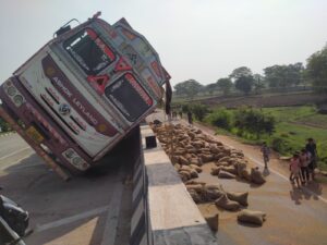टायर फटने से ट्रक हुई अनियंत्रित, सड़क पर बिखरे बोरे