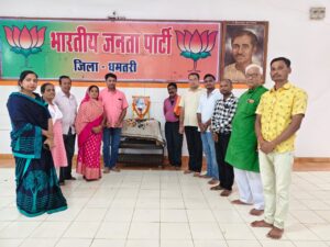 धमतरी। स्वामी विवेकानंद वार्ड में वार्ड के भाजपा कार्यकर्ताओं द्वारा डॉ. श्यामा प्रसाद मुखर्जी की जयंती मनाई गई। उक्त अवसर पर भाजपा जिला कोषाध्यक्ष चेतन हिंदुजा, युवा मोर्चा जिला उपाध्यक्ष देवेश अग्रवाल, वरिष्ठ सदस्य केवल साहू, नरेंद्र मिश्रा, विद्याधर दीवान, वार्ड पार्षद विभा चंद्राकर, पूर्व पार्षद सुशीला तिवारी, बूथ अध्यक्ष उमेश शाह, शेषु सोनवानी, संतोष मडामें, भारती शाह, सतेंद्र शर्मा, गूंज सोनी अन्य वार्डवासी उपस्थित रहे।