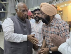 कांग्रेस राष्टीय अध्यक्ष मल्लिकार्जुन खरगे का रायपुर एयरपोर्ट पर नागरिक सहकारी बैंक अध्यक्ष हरमीत सिंह होरा ने किया आत्मीय स्वागत