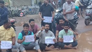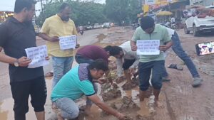 कीचड़ भरी सड़कों पर शहर कांग्रेस का अनोखा प्रदर्शन:धान व बेशर्म के पौधे रोपे, राहगीरों को भेंट किए कमल के फूल