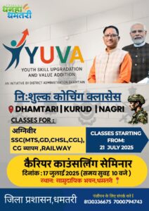 धमतरी 10 जुलाई 2025/ जिला प्रशासन और खेल एवं युवा कल्याण विभाग के संयुक्त तत्वावधान में आगामी अग्निवीर, एसएससी, सीजी व्यापक, रेल्वे आदि परीक्षाओं में शामिल होने वाले अभ्यर्थियों के लिए 17 जुलाई को कार्यशाला आयोजित की जाएगी। यह कार्यशाला स्थानीय समुदायिक भवन धमतरी में सुबह 10 बजे से आयोजित होगी। प्रभारी जिला खेल अधिकारी ने बताया कि इस कार्यशाला में विभिन्न प्रतियोगी परीक्षाओं में शामिल होने वाले अभ्यर्थियों को कलेक्टर, पुलिस अधीक्षक, वनमण्डलाधिकारी, सीईओ जिला पंचायत सहित अधिकारियों द्वारा मार्गदर्शन प्रदाय किया जाएगा। कार्यशला में आने वाले अभ्यर्थियों को उक्त परीक्षाओं से संबंधित शंकाओं का समाधान मिल पायेगा। इससे आत्मविश्वास बढ़ेगा तथा परीक्षा संबंधी तनाव भी कम होगा। इसके अलावा जिले के तीनों अनुभाग धमतरी, कुरूद और नगरी में जुलाई से अक्टूबर तक जिला प्रशासन के सहयोग से अग्निवीर, एसएससी, सीजी व्यापम, रेल्वे आदि परीक्षाओं के लिए निःशुल्क कोचिंग शुरू हो रहा है, जिसका लाभ जिले के युवा उठा सकते हैं।