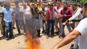 पूर्व मुख्यमंत्री के घर कार्यवाही को लेकर कांग्रेसियों ने केंद्र सरकार व ईडी का फूंका पुतला