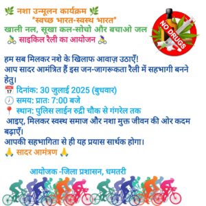 *धमतरी, 29 जुलाई 2025/ जिले में नशा मुक्त भारत अभियान के तहत नशे के खिलाफ जनजागरूकता फैलाने की दिशा में एक महत्वपूर्ण पहल की जा रही है। इस क्रम में कल बुधवार 30 जुलाई को प्रातः 7.00 बजे जिला मुख्यालय स्थित पुलिस लाइन रुद्री चौक से गंगरेल तक साइकिल रैली निकाली जाएगी।*