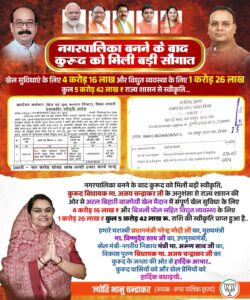 नगरपालिका बनने के बाद कुरूद को बड़ी स्वीकृति विधायक अजय चन्द्राकर के अनुशंसा से मिली है.राज्य शासन की ओर से अटल बिहारी बाजपेयी खेल मैदान में संपूर्ण खेल सुविधा के लिए 4 करोड़ 16 लाख और बिजली पोल सहित विधुत व्यवस्था के लिए 1 करोड़ 26 लाख राशि की स्वीकृति प्राप्त हुआ है. ज्योति भानु चन्द्राकर अध्यक्ष नगर पालिका परिषद कुरूद ने प्रधानमंत्री नरेन्द्र मोदी का, मुख्यमंत्री विष्णुदेव साय का, उपमुख्यमंत्री, खेल मंत्री-नगरीय निकाय मंत्री अरूण साव का, विकास पुरुष विधायक अजय चन्द्राकर का कुरूद के जनता की ओर से हार्दिक आभार व्यक्त किया है. खेल सुविधाएं और विधुत व्यवस्था के लिए कुल 5 करोड़ 42 लाख की स्वीकृति मिली है.