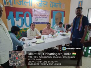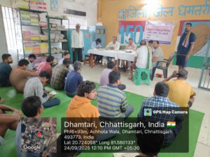 संचालनालय आयुष रायपुर के निर्देशानुसार जिला शासकीय आयुष पॉलीक्नीनिक धमतरी के डॉ. योगेश कुमार नेताम, (आयुष चिकित्सक, संजय कुमार पटेल (फार्मासिस्ट) एवं गौरव सोनी (पंचकर्म सहायक) के द्वारा जिला जेल धमतरी में एक दिवसीय आयुर्वेदिक स्वास्थ्य जाँच परीक्षण शिविर आयोजित कर जेल में परिरूद्ध बंदियों का उच्चरक्तचाप, मधुमेह, उदरविकार, त्वचाविकार, वातरोग इत्यादि रोगों की जांचकर आयुर्वेद औषधि एवं रोगो के बचाव संबंधी परामर्श दिया गया। इस आयुर्वेद शिविर में 210 बंदियों का स्वास्थ्य परीक्षण तथा 28 लोगो का विशेष उपचार एवं स्वास्थ्यं मरामर्श दिया गया। जांच कर औषधी वितरण किया गया। उक्त शिविर में एन.के. डहरिया, सहायक जेल अधीक्षक, लीलाराम साहू, फार्मासिस्ट एवं अन्य कर्मचारीगण उपस्थित रहे।