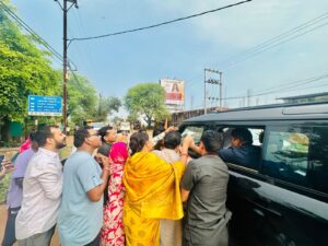 धमतरी-बागेश्वर पीठाधीश्वर धीरेन्द्र शास्त्री का आराध्य वन देवी अंगारमोती माता के दर्शन हेतु अल सुबह आगमन हुआ. दर्शन पक्ष वापसी के समय आमा तालाब चौक अंबेडकर वार्ड में महापौर रामू रोहरा, भाजपा प्रदेश कार्यालय सह मंत्री प्रीतेश गांधी एवं नगर निगम के पूर्व सभापति राजेंद्र शर्मा सहित निगम के पार्षद गणों एवं गणमान्य नागरिकों ने आशीर्वाद लेकर स्वागत करते हुए क्षेत्रवासियों के सुख समृद्धि एवं खुशहाली के लिए प्रार्थना की महापौर रामू रोहरा ने नगर के विकास हेतु सकारात्मक ऊर्जा तथा समर्पण के साथ जनता के हित में विकास कार्यों को आगे बढ़ाने हेतु कार्य करने का आशीर्वाद प्राप्त किया इसके साथ ही उपस्थित जनों द्वारा गगनभेदी सनातन धर्म के पताका फहराने संबंधी नारे लगा महाराज श्री ने भी सभी से हिंदुत्व एवं सनातन को मजबूत करने के लिए आह्वान करते हुए हाथ जोड़कर आशीर्वाद देकर विदा हुए। उक्त अवसर पर मेघराज ठाकुर, पिंटू यादव, कुलेश सोनी, तल्लीन पुरी गोस्वामी, शैलेश रजक, विभा चंद्राकर ,अनीता अग्रवाल, चंद्रभागा साहू, सरिता यादव, मुकेश शर्मा संजय देवांगन हेमंत बंजारे ललिता नाडेम, देवा नाडेम सहित अनेक गणमान्य लोग उपस्थित रहे।
