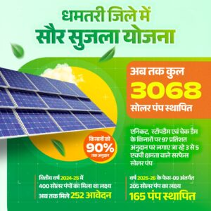 वित्तीय वर्ष 2024-25 में सौर सुजला योजना के सातवें चरण में धमतरी जिले को 400 सोलर पंपों का लक्ष्य प्राप्त हुआ था। इसके विरुद्ध अब तक 252 आवेदन प्राप्त हुए हैं, जिनकी स्वीकृति और स्थापना प्रक्रिया क्रेडा द्वारा की जा रही है। वहीं वर्ष 2025-26 के फेस-09 अंतर्गत जिले को 205 सोलर पंप का लक्ष्य मिला है, जिनमें से 165 पंप स्थापित किए जा चुके हैं और शेष पर तेजी से कार्य चल रहा है।