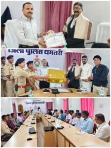 धमतरी। धमतरी पुलिस परिवार के वरिष्ठ सदस्य सहायक उप निरीक्षक (सउनि.) दिलहरण सिंह ठाकुर को उनकी दीर्घ, अनुकरणीय एवं समर्पित सेवाओं के लिए आज ससम्मान विदाई दी गई।वर्ष 1983 में रायपुर जिले में आरक्षक पद पर भर्ती होकर, उन्होंने अपने कार्यकाल में विभाग के प्रति 42 वर्ष 03 माह 11 दिन तक निरंतर सेवा दी।सेवा काल के दौरान उन्होंने विभिन्न थानों और पुलिस कार्यालयों में पदस्थ रहकर सदैव अनुशासन, कर्तव्यनिष्ठा और ईमानदारी से अपने दायित्वों का निर्वहन किया।सेवानिवृत्ति अवसर पर पुलिस अधीक्षक कार्यालय धमतरी में विदाई समारोह आयोजित किया गया।पुलिस अधीक्षक सूरज सिंह परिहार ने सउनि. दिलहरण सिंह ठाकुर को शाल, श्रीफल एवं उपहार भेंट कर सम्मानित किया तथा उनके दीर्घ सेवा काल की सराहना की।इस अवसर पर उप पुलिस अधीक्षक सुश्री मोनिका मरावी, सुश्री मीना साहू, निरीक्षक (एम.) अखिलेश शुक्ला, लक्ष्मी ध्रुव,सउनि. दिनेश सोनकर, डोमार सिंह ध्रुव, राजेश दीवान, प्रेमलाल सिन्हा, रामावतार राजपूत आदि उपस्थित रहे.
