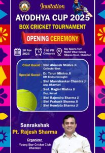 अयोध्या कप 2025 बॉक्स क्रिकेट टूर्नामेंट का 10 नवंबर को होगा भव्य शुभारंभ, मुख्य अतिथि होंगे कलेक्टर अबिनाश मिश्रा