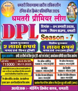 धमतरी। धमतरी विधानसभा स्तरीय रात्रिकालीन टेनिस बाल क्रिकेट प्रतियोगिता 2026 धमतरी प्रीमियर लीग (डीपीएल सीजन 7) का रविवार 4 जनवरी से मिशन ग्राउंड में शुभारंभ होगा। उक्त आयोजन मॉर्निंग क्रिकेट क्लब धमतरी द्वारा किया जा रहा है। प्रतियोगिता में विजेता टीम को 2 लाख रूपये नगद एवं विनर ट्रॉफी तथा उपविजेता को 1 लाख रूपये नगद एवं रनरअप ट्रॉफी प्रदान की जाएगी। मैन ऑफ द सीरीज के खिलाड़ी को 15 हजार रूपये नगद एवं ट्राफी, बेस्ट बॉलर को 10 हजार रूपये नगद एवं ट्राफी, बेस्ट बेट्स मैन को 10 हजार रूपये नगद एवं ट्राफी, मैन ऑफ द मैच फाइनल के खिलाड़ी को 10 हजार रूपये नगद एवं ट्रॉफी समेत अन्य आकर्षक पुरस्कार प्रदान किए जाएंगे। प्रतियोगिता में शहर की 20 और ग्रामीण अंचल की 12 चुनिंदा टीमों समेत कुल 32 टीमें हिस्सा लेंगी। टीमों को 8 ग्रुप में बांटा गया है। प्रत्येक ग्रुप में 4 टीम होगी। जिनके मध्य लीग राउंड के मुकाबले होंगे। जो 8-8 ओव्हरों का होगा। इनमें से सेलेक्ट टीमों को नाकआउट राउंड में खेलना होगा। जो 10-10 ओव्हरों का होगा। प्रतिदिन 4 मैच खेले जाएंगे। जिनका समय पहला 6 बजे, दूसरा 7.30 बजे, तीसरा 9 बजे तथा अंतिम मैच 10.30 बजे से खेला जाएगा। स्पर्धा में कुल 32 टीमें है जिसमें ग्रामीण अंचल की तरसींवा, भटगांव, तेलीनसत्ती, सोरम, अछोटा, परसतराई, दोनर, अरौद, संबलपुर, लोहरसी, सेहराडबरी तथा शंकरदाह की टीम को प्रवेश दिया गया है। इसी तरह शहर की टीमों में पोस्ट आफिस वार्ड, विवेकानंद वार्ड, सदर उत्तर, बठेना, अंबेडकर वार्ड, रिसाईपारा, नवागांव, कोष्टापारा, सुंदरगंज वार्ड, हटकेशर, जालमपुर, सोरिद, औद्योगिक वार्ड, एसवीएन वार्ड, मकेश्वर वार्ड, महात्मा गांधी वार्ड, ब्राम्हणपारा, रामपुर, साल्हेवार पारा एवं डाकबंगला वार्ड की टीम को प्रवेश दिया गया है।