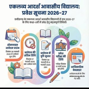 धमतरी। छत्तीसगढ़ शासन द्वारा संचालित एकलव्य आदर्श आवासीय विद्यालयों में शैक्षणिक सत्र 2026-27 हेतु कक्षा 6वीं में प्रवेश के लिए ऑनलाइन आवेदन प्रक्रिया प्रारंभ की जा रही है। यह विद्यालय विशेष रूप से अनुसूचित जनजाति वर्ग के विद्यार्थियों को गुणवत्तापूर्ण, आवासीय एवं आधुनिक शिक्षा उपलब्ध कराने के उद्देश्य से संचालित किए जा रहे हैं।एकलव्य विद्यालयों में विद्यार्थियों को नि:शुल्क आवास, भोजन, पुस्तकें, गणवेश, खेलकूद एवं शैक्षणिक संसाधन उपलब्ध कराए जाते हैं, जिससे ग्रामीण एवं दूरस्थ अंचलों के प्रतिभाशाली बच्चे भी राष्ट्रीय स्तर की शिक्षा प्राप्त कर सकें। ऑनलाइन आवेदन प्रारंभ 8 जनवरी, आवेदन की अंतिम तिथि 7 फरवरी, आवेदन में त्रुटि सुधार 8 फरवरी से 10 फरवरी तक, प्रवेश परीक्षा 1 मार्च को होगा. इच्छुक अभिभावक एवं विद्यार्थी आधिकारिक वेबसाइट पर जाकर ऑनलाइन आवेदन कर सकते हैं।
