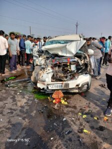 कार व ट्रक में हुई जबरदस्त भिड़ंत, 1 की मौत, 4 गंभीर, आक्रोशित ग्रामीणो ने किया चक्काजाम
