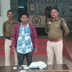 पूछताछ में अपन नाम खेमराज उर्फ नानू नगारची, पिता नंद कुमार नगारची, 35 वर्ष, निवासी डांडेसरा, थाना कुरूद, जिला धमतरी (छ.ग.) बताया।तलाशी के दौरान आरोपी के कब्जे से 385 ग्राम गांजा (कीमती लगभग 7,500रुपये)5 छोटे पैकेट गांजा बिक्री रकम 1,750 रुपये