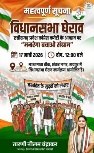 छत्तीसगढ प्रदेश कांग्रेस कमेटी के आव्हान पर मनरेगा बचाओ संग्राम सहित प्रदेश के जनहित के मुद्दों को लेकर 17 मार्च को दोपहर 12 बजे, भारतमाता चौक, शंकर नगर, रायपुर में विधानसभा घेराव कार्यक्रम आयोजित है।तारणी नीलम चंद्राकर