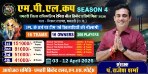 धमतरी- शहर के सार्वजनिक सरोकार से जुड़े हुए विभिन्न धार्मिक सामाजिक आयोजन के बाद धर्म प्रेमी समाजसेवी पंडित राजेश शर्मा द्वारा 22 मार्च से प्रारंभ हुआ खेल पखवाड़ा फुटबॉल तथा बच्चों के विभिन्न खेल प्रतिस्पर्धाओं के बाद 3 अप्रैल से क्रिकेट के रोमांच में तब्दील हो जाएगा जिसकी काफी लंबे समय से प्रतीक्षा की जा रही है शहर के खेल प्रेमी इस आयोजन के प्रति काफी उत्सुक हैं क्योंकि इसमें हजारों रुपए के पुरस्कार के साथ ही उत्कृष्ट खिलाड़ियों के लिए भी अलग से इनाम की व्यवस्था की गई है जहां प्रथम पुरस्कार के रूप में 1 लाख 51000 हजार, दूसरा ईनाम 81000 हजार रुपए, वहीं तीसरा 51000 हजार तथा चतुर्थ 41000 हजार रखा गया है। इसके साथ ही मैन ऑफ द मैच खिलाड़ियों तथा उत्कृष्ट प्रदर्शन करने वालों को 10000 रूपए से लेकर 5000 रुपए तक नगद पुरस्कार दिए जाएंगे। अपने तरीके से अभी तक के होने वाले आयोजनों से अलग किस्म के इस आयोजन में विशालकाय स्किन भी आकर्षण का केंद्र होगा चार दिशाओं में लगने वाले कैमरे से दिखाने की मैच को व्यवस्था होगी, आयोजन समिति के संरक्षक तथा आयोजन पंडित राजेश शर्मा ने कहा है कि शहर के खेल इतिहास में अभी तक के होने वाले आयोजनों में इस आयोजन को अलग अंदाज में शहर वासियों को समर्पित करने का प्रयास किया जा रहा है जिसके लिए नई टेक्नोलॉजी के साथ ही खिलाड़ियों को प्रोत्साहित करने हेतु बड़ी राशि के साथ ही रनर कप भी प्रदान किए जाएंगे।