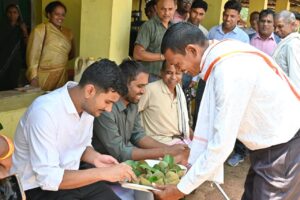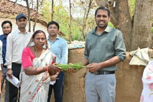 शकुन बाई ने अपनी बाड़ी में उगाए गए मुनगा (सहजन) को कलेक्टर को भेंट किया तथा पारंपरिक मड़िया पेय से आत्मीय स्वागत
